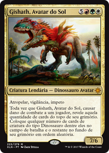 | Rules | Vigilance, trample, haste Whenever Gishath, Sun's Avatar deals combat damage to a player, reveal that many cards from the top of your library. Put any number of Dinosaur creature cards from among them onto the battlefield and the rest on the bottom of your library in a random order. |
