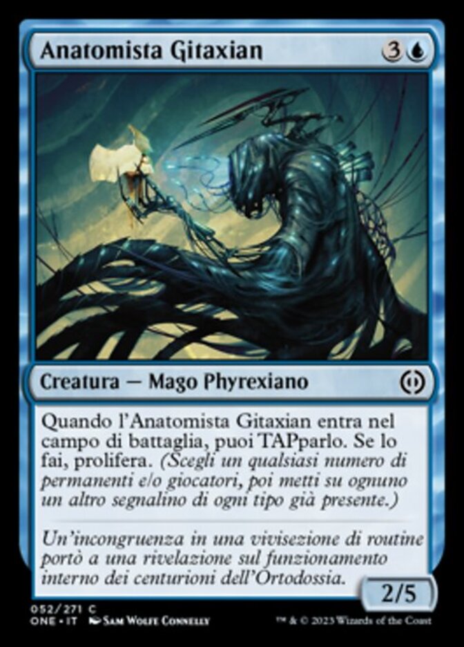 | Rules | When Gitaxian Anatomist enters the battlefield, you may tap it. If you do, proliferate. (Choose any number of permanents and/or players, then give each another counter of each kind already there.) |