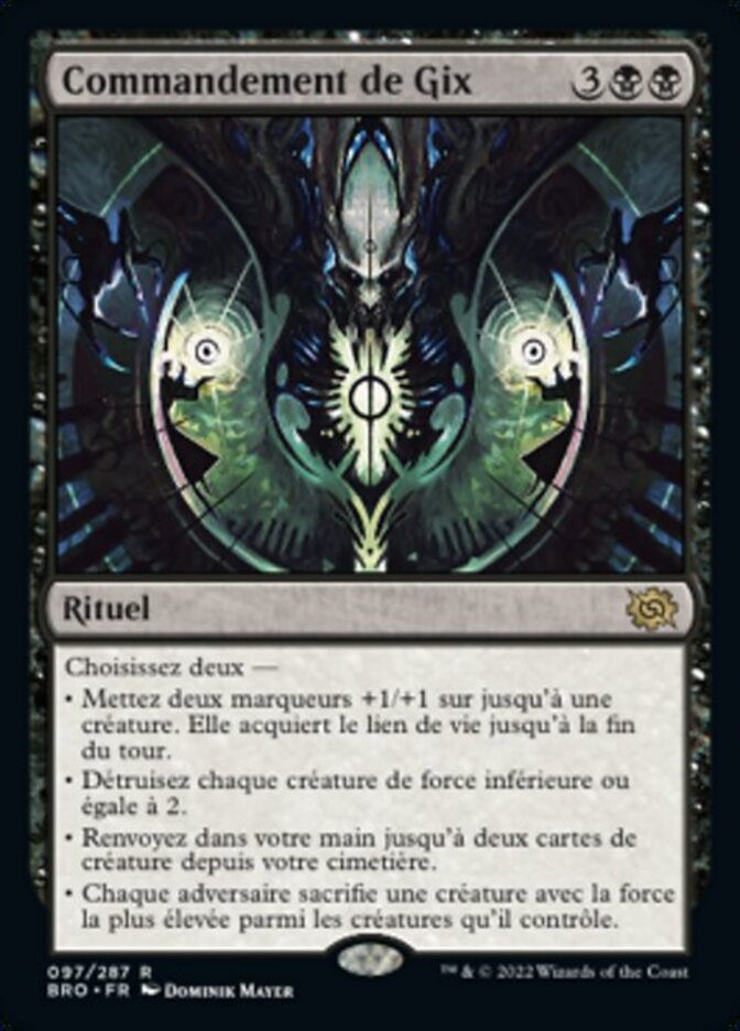 | Rules | Choose two — • Put two +1/+1 counter on up to one creature. It gains lifelink until end of turn. • Destroy each creature with power 2 or less. • Return up to two creature cards from your graveyard to your hand. • Each opponent sacrifices a creature with the highest power among creatures they control. |