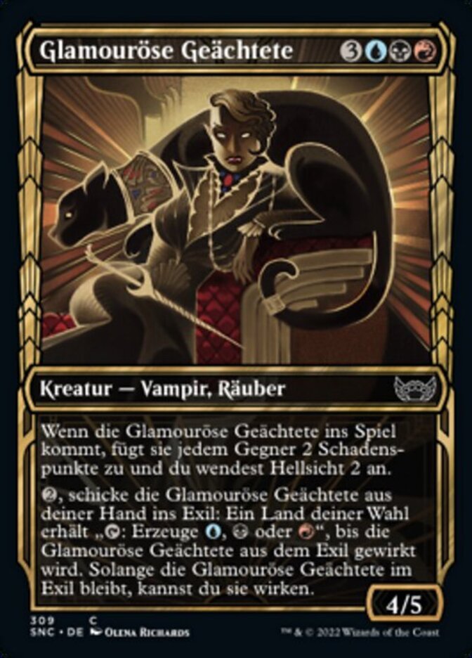 | Rules | When Glamorous Outlaw enters the battlefield, it deals 2 damage to each opponent and you scry 2. , Exile Glamorous Outlaw from your hand: Target land gains ": Add , , or " until Glamorous Outlaw is cast from exile. You may cast Glamorous Outlaw for as long as it remains exiled. |