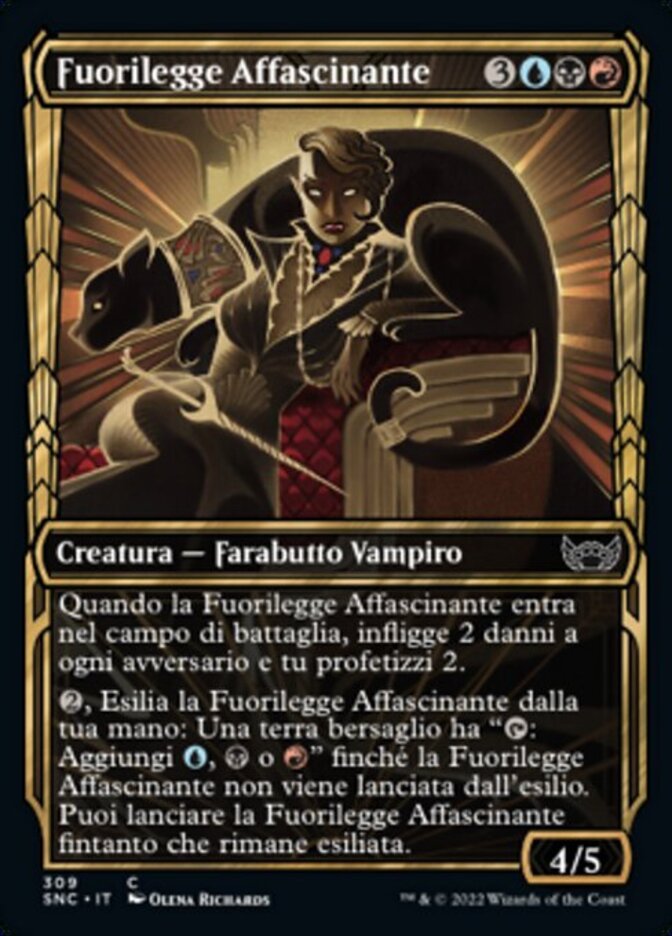 | Rules | When Glamorous Outlaw enters the battlefield, it deals 2 damage to each opponent and you scry 2. , Exile Glamorous Outlaw from your hand: Target land gains ": Add , , or " until Glamorous Outlaw is cast from exile. You may cast Glamorous Outlaw for as long as it remains exiled. |