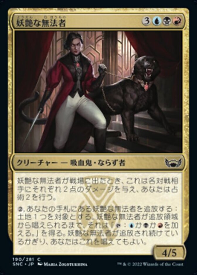 | Rules | When Glamorous Outlaw enters the battlefield, it deals 2 damage to each opponent and you scry 2. , Exile Glamorous Outlaw from your hand: Target land gains ": Add , , or " until Glamorous Outlaw is cast from exile. You may cast Glamorous Outlaw for as long as it remains exiled. |