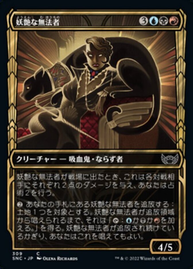 | Rules | When Glamorous Outlaw enters the battlefield, it deals 2 damage to each opponent and you scry 2. , Exile Glamorous Outlaw from your hand: Target land gains ": Add , , or " until Glamorous Outlaw is cast from exile. You may cast Glamorous Outlaw for as long as it remains exiled. |