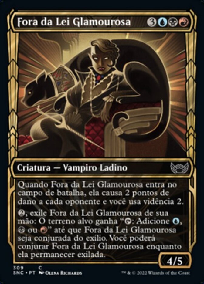| Rules | When Glamorous Outlaw enters the battlefield, it deals 2 damage to each opponent and you scry 2. , Exile Glamorous Outlaw from your hand: Target land gains ": Add , , or " until Glamorous Outlaw is cast from exile. You may cast Glamorous Outlaw for as long as it remains exiled. |