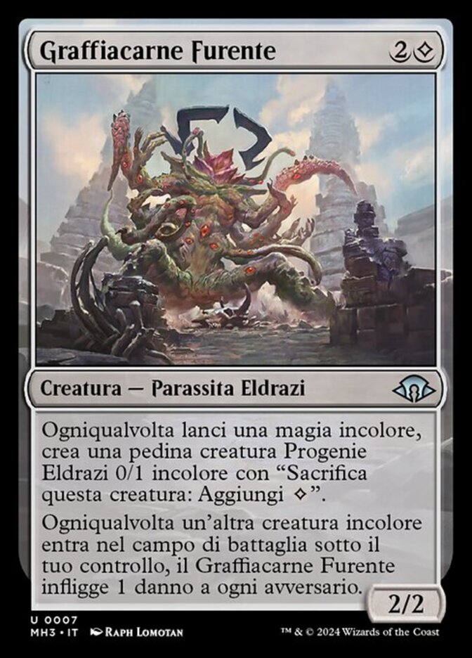 | Rules | Whenever you cast a colorless spell, create a 0/1 colorless Eldrazi Spawn creature token with "Sacrifice this creature: Add ." Whenever another colorless creature enters the battlefield under your control, Glaring Fleshraker deals 1 damage to each opponent. |