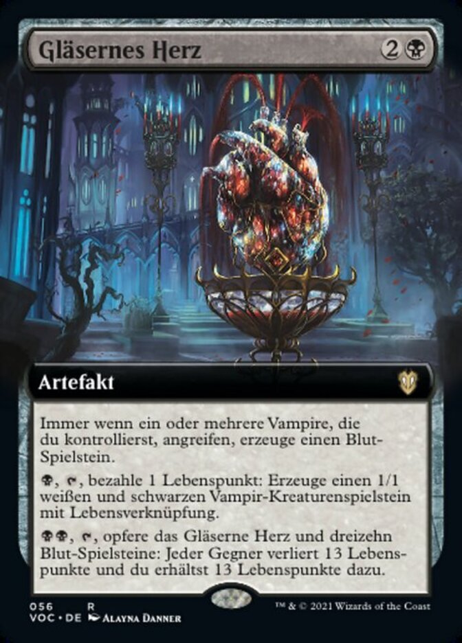 | Rules | Whenever one or more Vampires you control attack, create a Blood token. (It's an artifact with ", , Discard a card, Sacrifice this artifact: Draw a card.") , , Pay 1 life: Create a 1/1 white and black Vampire creature token with lifelink. , , Sacrifice Glass-Cast Heart and thirteen Blood tokens: Each opponent loses 13 life and you gain 13 life. |