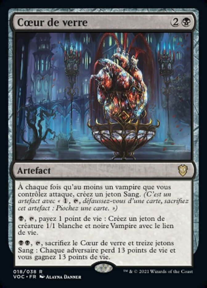 | Rules | Whenever one or more Vampires you control attack, create a Blood token. (It's an artifact with ", , Discard a card, Sacrifice this artifact: Draw a card.") , , Pay 1 life: Create a 1/1 white and black Vampire creature token with lifelink. , , Sacrifice Glass-Cast Heart and thirteen Blood tokens: Each opponent loses 13 life and you gain 13 life. |