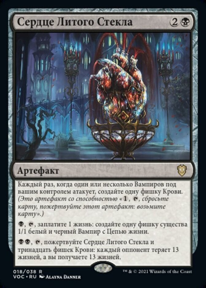 | Rules | Whenever one or more Vampires you control attack, create a Blood token. (It's an artifact with ", , Discard a card, Sacrifice this artifact: Draw a card.") , , Pay 1 life: Create a 1/1 white and black Vampire creature token with lifelink. , , Sacrifice Glass-Cast Heart and thirteen Blood tokens: Each opponent loses 13 life and you gain 13 life. |