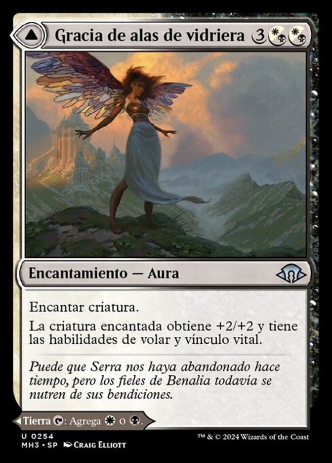 | Rules | Enchant creature Enchanted creature gets +2/+2 and has flying and lifelink. // Age-Graced Chapel enters the battlefield tapped. : Add or . |