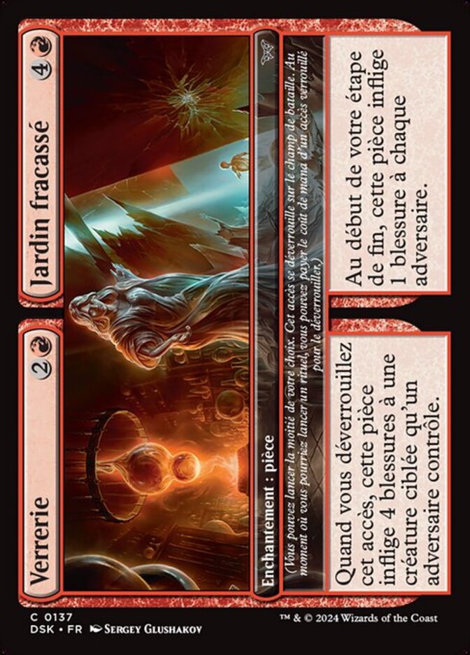 | Rules | (You may cast either half. That door unlocks on the battlefield. As a sorcery, you may pay the mana cost of a locked door to unlock it.) When you unlock this door, this Room deals 4 damage to target creature an opponent controls. // (You may cast either half. That door unlocks on the battlefield. As a sorcery, you may pay the mana cost of a locked door to unlock it.) At the beginning of your end step, this Room deals 1 damage to each opponent. |