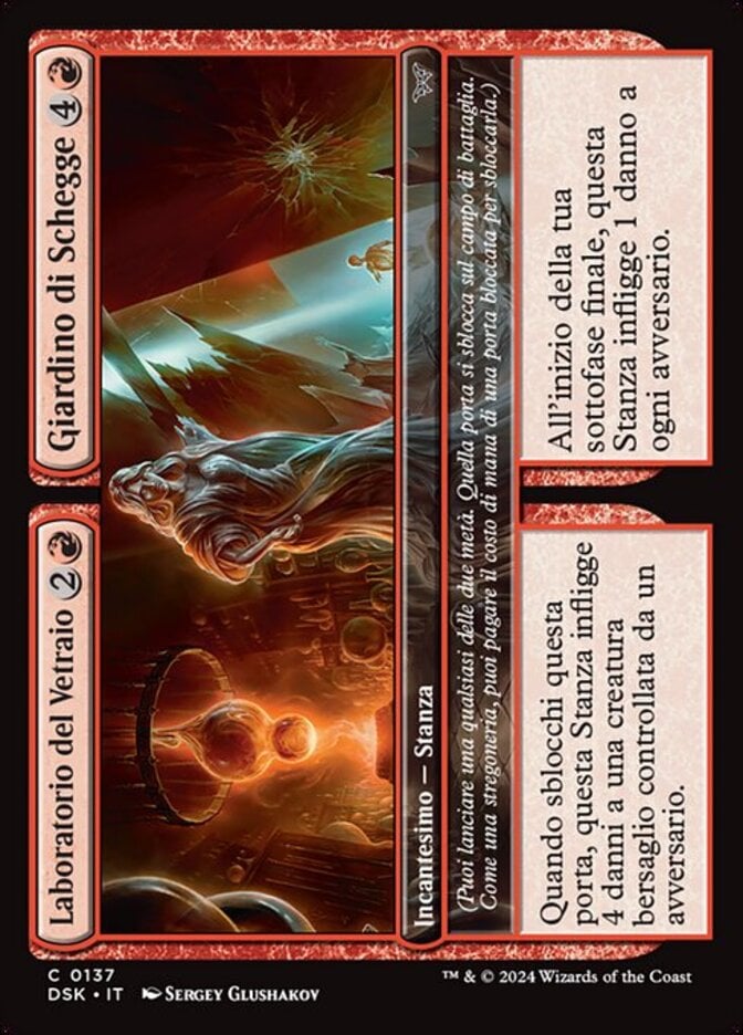 | Rules | (You may cast either half. That door unlocks on the battlefield. As a sorcery, you may pay the mana cost of a locked door to unlock it.) When you unlock this door, this Room deals 4 damage to target creature an opponent controls. // (You may cast either half. That door unlocks on the battlefield. As a sorcery, you may pay the mana cost of a locked door to unlock it.) At the beginning of your end step, this Room deals 1 damage to each opponent. |