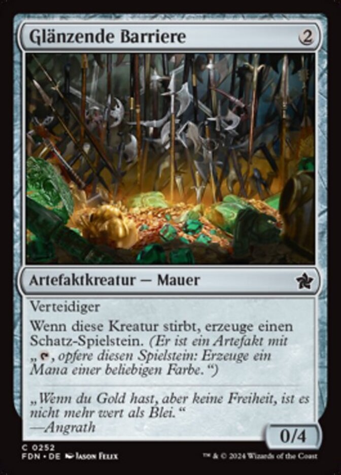 | Rules | Defender When Gleaming Barrier dies, create a Treasure token. (It's an artifact with ", Sacrifice this artifact: Add one mana of any color.") |