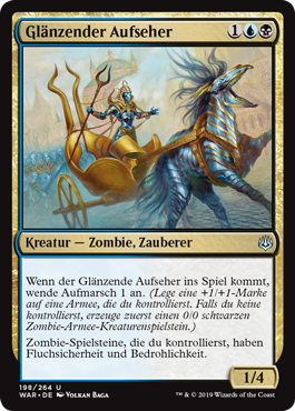 | Rules | When Gleaming Overseer enters the battlefield, amass 1. (Put a +1/+1 counter on an Army you control. If you don't control one, create a 0/0 black Zombie Army creature token first.) Zombie tokens you control have hexproof and menace. |