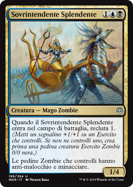 | Rules | When Gleaming Overseer enters the battlefield, amass 1. (Put a +1/+1 counter on an Army you control. If you don't control one, create a 0/0 black Zombie Army creature token first.) Zombie tokens you control have hexproof and menace. |
