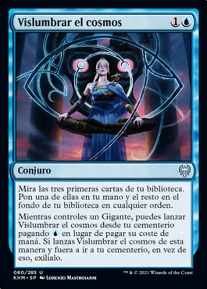 | Rules | Look at the top three cards of your library. Put one of them into your hand and the rest on the bottom of your library in any order. As long as you control a Giant, you may cast Glimpse the Cosmos from your graveyard by paying rather than paying its mana cost. If you cast Glimpse the Cosmos this way and it would be put into your graveyard, exile it instead. |
