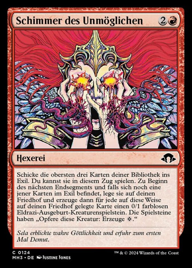 | Rules | Exile the top three cards of your library. You may play those cards this turn. At the beginning of the next end step, if any of those cards remain exiled, put them into your graveyard, then create a 0/1 colorless Eldrazi Spawn creature token for each card put into your graveyard this way. Those tokens have "Sacrifice this creature: Add ." |