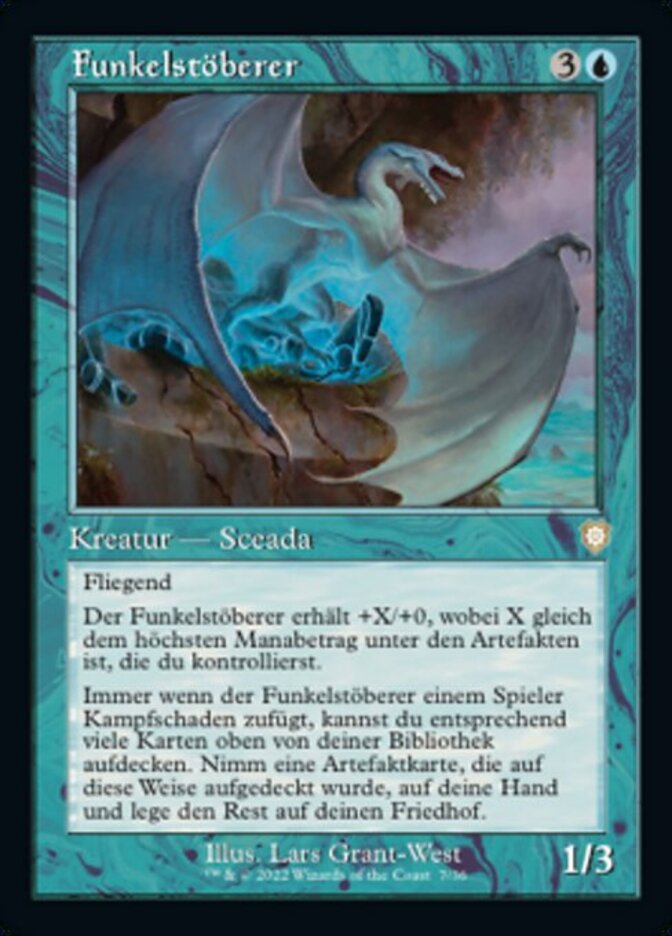 | Rules | Flying Glint Raker gets +X/+0, where X is the highest mana value among artifacts you control. Whenever Glint Raker deals combat damage to a player, you may reveal that many cards from the top of your library. Put an artifact card revealed this way into your hand and the rest into your graveyard. |