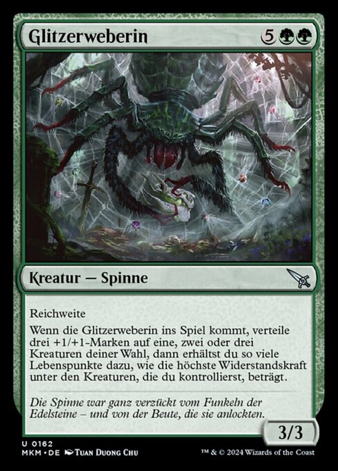 | Rules | Reach When Glint Weaver enters the battlefield, distribute three +1/+1 counters among one, two, or three target creatures, then you gain life equal to the greatest toughness among creatures you control. |