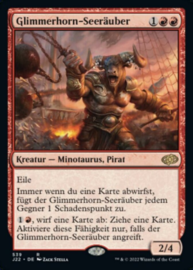 | Rules | Haste Whenever you discard a card, Glint-Horn Buccaneer deals 1 damage to each opponent. , Discard a card: Draw a card. Activate only if Glint-Horn Buccaneer is attacking. |