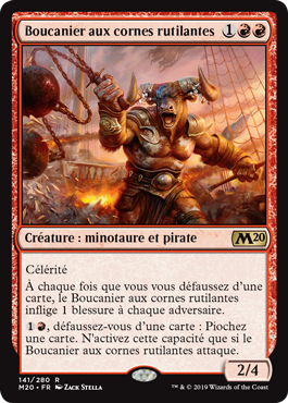 | Rules | Haste Whenever you discard a card, Glint-Horn Buccaneer deals 1 damage to each opponent. , Discard a card: Draw a card. Activate only if Glint-Horn Buccaneer is attacking. |