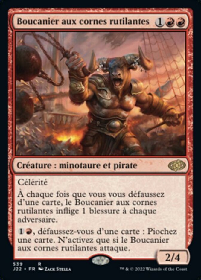 | Rules | Haste Whenever you discard a card, Glint-Horn Buccaneer deals 1 damage to each opponent. , Discard a card: Draw a card. Activate only if Glint-Horn Buccaneer is attacking. |