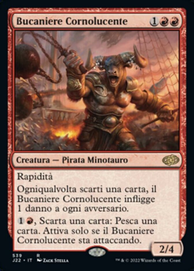 | Rules | Haste Whenever you discard a card, Glint-Horn Buccaneer deals 1 damage to each opponent. , Discard a card: Draw a card. Activate only if Glint-Horn Buccaneer is attacking. |