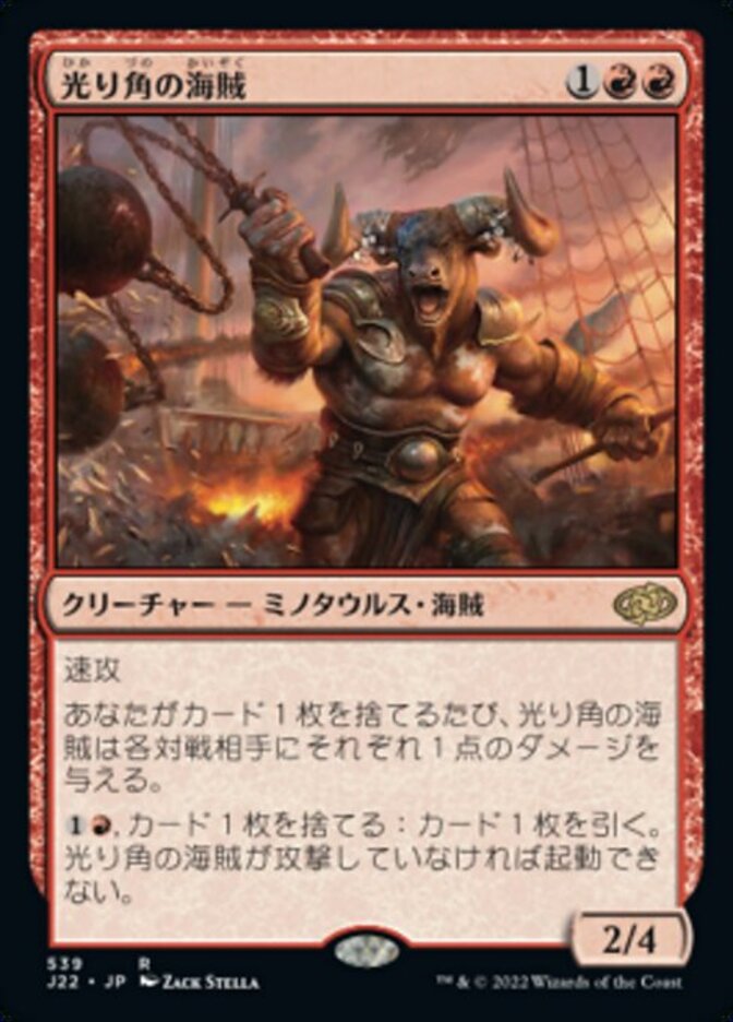 | Rules | Haste Whenever you discard a card, Glint-Horn Buccaneer deals 1 damage to each opponent. , Discard a card: Draw a card. Activate only if Glint-Horn Buccaneer is attacking. |