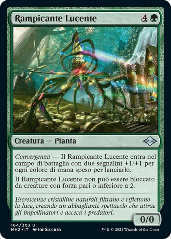| Rules | Converge — Glinting Creeper enters the battlefield with two +1/+1 counters on it for each color of mana spent to cast it. Glinting Creeper can't be blocked by creatures with power 2 or less. |