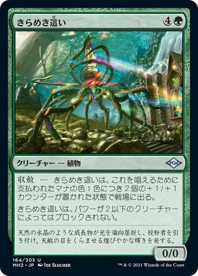 | Rules | Converge — Glinting Creeper enters the battlefield with two +1/+1 counters on it for each color of mana spent to cast it. Glinting Creeper can't be blocked by creatures with power 2 or less. |