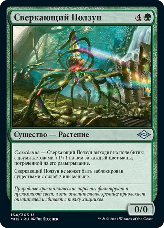 | Rules | Converge — Glinting Creeper enters the battlefield with two +1/+1 counters on it for each color of mana spent to cast it. Glinting Creeper can't be blocked by creatures with power 2 or less. |