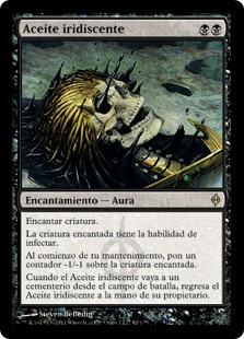 | Rules | Enchant creature Enchanted creature has infect. At the beginning of your upkeep, put a -1/-1 counter on enchanted creature. When Glistening Oil is put into a graveyard from the battlefield, return Glistening Oil to its owner's hand. |