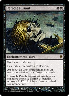 | Rules | Enchant creature Enchanted creature has infect. At the beginning of your upkeep, put a -1/-1 counter on enchanted creature. When Glistening Oil is put into a graveyard from the battlefield, return Glistening Oil to its owner's hand. |