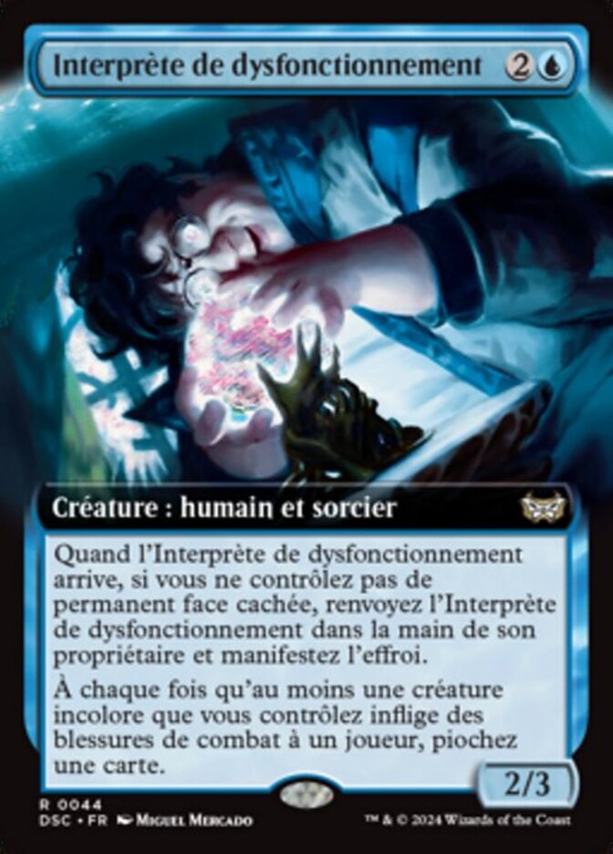 | Rules | When Glitch Interpreter enters, if you control no face-down permanents, return Glitch Interpreter to its owner's hand and manifest dread. Whenever one or more colorless creatures you control deal combat damage to a player, draw a card. |