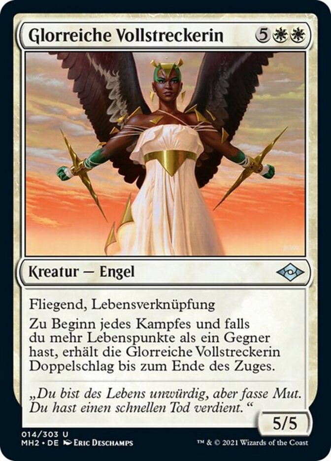 | Rules | Flying, lifelink At the beginning of each combat, if you have more life than an opponent, Glorious Enforcer gains double strike until end of turn. |