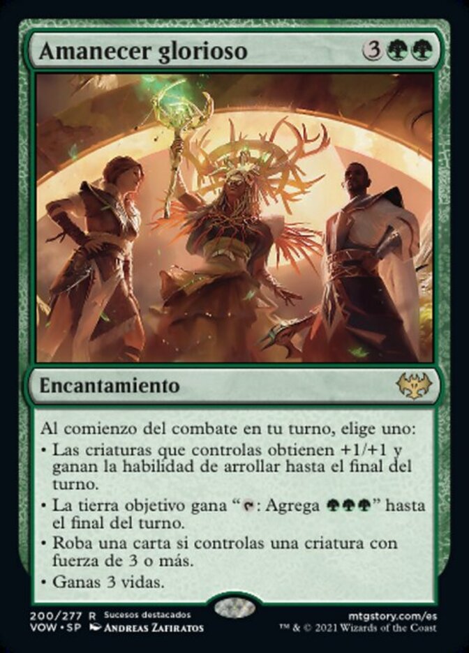 | Rules | At the beginning of combat on your turn, choose one — • Creatures you control get +1/+1 and gain trample until end of turn. • Target land gains ": Add " until end of turn. • Draw a card if you control a creature with power 3 or greater. • You gain 3 life. |