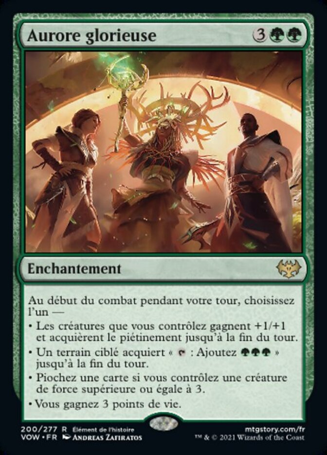 | Rules | At the beginning of combat on your turn, choose one — • Creatures you control get +1/+1 and gain trample until end of turn. • Target land gains ": Add " until end of turn. • Draw a card if you control a creature with power 3 or greater. • You gain 3 life. |
