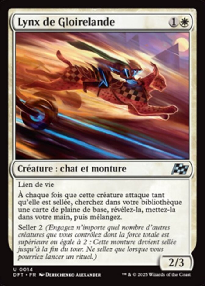 | Rules | Lifelink Whenever this creature attacks while saddled, search your library for a basic Plains card, reveal it, put it into your hand, then shuffle. Saddle 2 (Tap any number of other creatures you control with total power 2 or more: This Mount becomes saddled until end of turn. Saddle only as a sorcery.) |