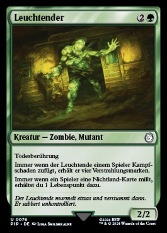 | Rules | Deathtouch Whenever Glowing One deals combat damage to a player, they get four rad counters. Whenever a player mills a nonland card, you gain 1 life. |