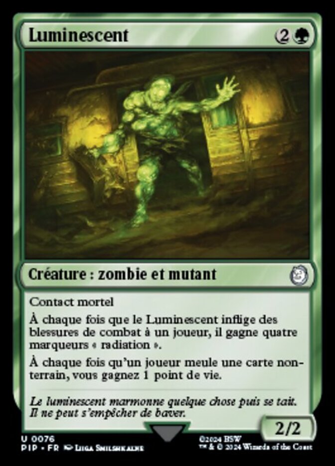 | Rules | Deathtouch Whenever Glowing One deals combat damage to a player, they get four rad counters. Whenever a player mills a nonland card, you gain 1 life. |