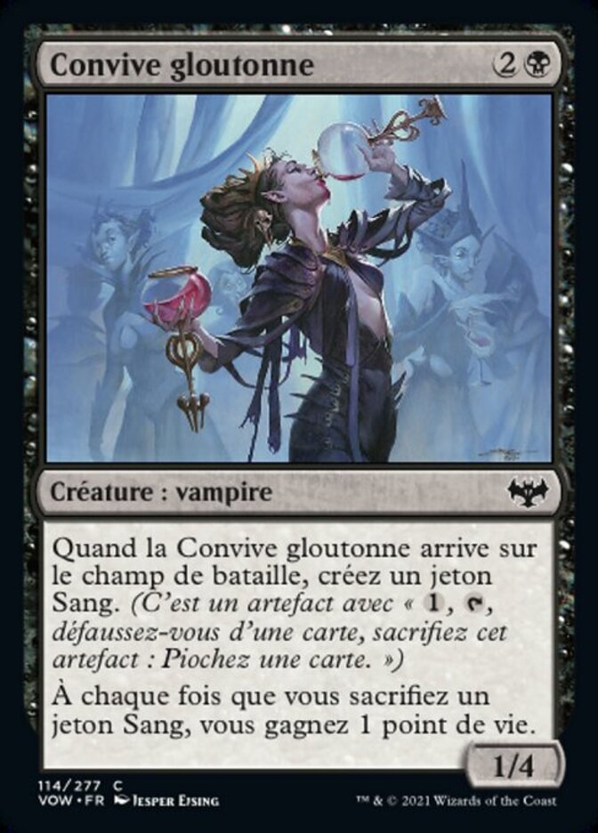 | Rules | When Gluttonous Guest enters the battlefield, create a Blood token. (It's an artifact with ", , Discard a card, Sacrifice this artifact: Draw a card.") Whenever you sacrifice a Blood token, you gain 1 life. |