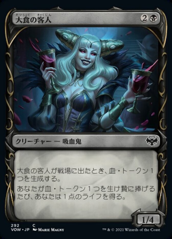 | Rules | When Gluttonous Guest enters the battlefield, create a Blood token. (It's an artifact with ", , Discard a card, Sacrifice this artifact: Draw a card.") Whenever you sacrifice a Blood token, you gain 1 life. |
