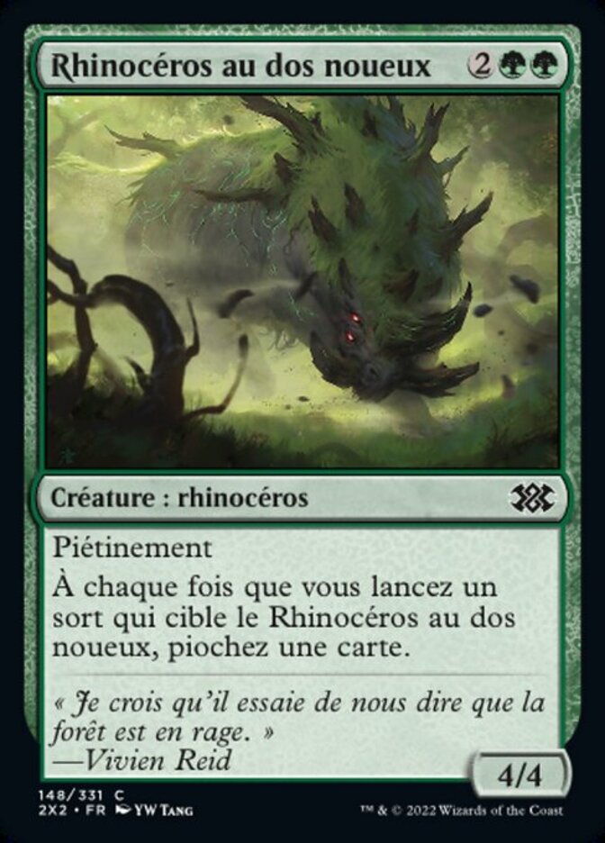 | Rules | Trample (This creature can deal excess combat damage to the player or planeswalker it's attacking.) Whenever you cast a spell that targets Gnarlback Rhino, draw a card. |