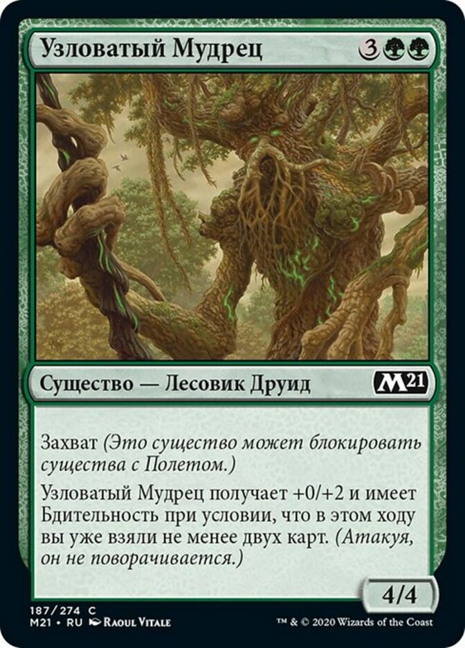 | Rules | Reach (This creature can block creatures with flying.) As long as you've drawn two or more cards this turn, Gnarled Sage gets +0/+2 and has vigilance. (Attacking doesn't cause it to tap.) |