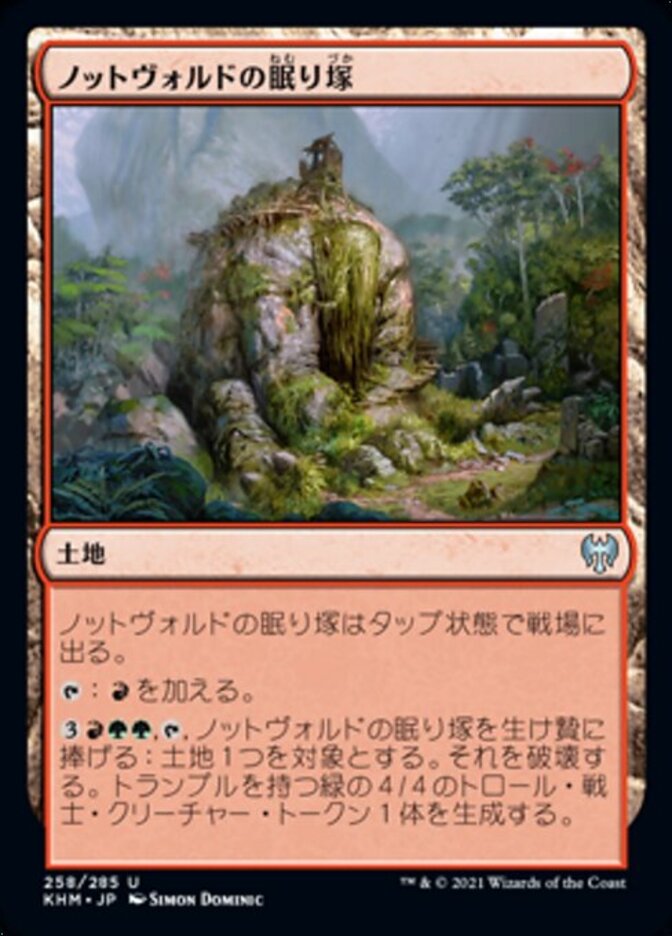 | Rules | Gnottvold Slumbermound enters the battlefield tapped. : Add . , , Sacrifice Gnottvold Slumbermound: Destroy target land. Create a 4/4 green Troll Warrior creature token with trample. |