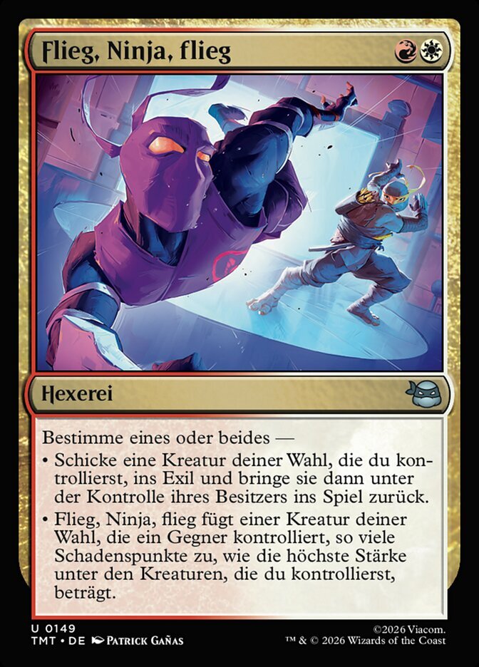 | Rules | Choose one or both — • Exile target creature you control, then return it to the battlefield under its owner's control. • Go Ninja Go deals damage equal to the greatest power among creatures you control to target creature an opponent controls. |