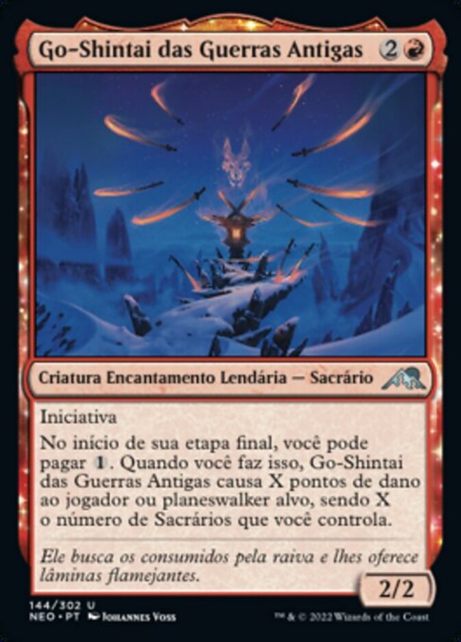 | Rules | First strike At the beginning of your end step, you may pay . When you do, Go-Shintai of Ancient Wars deals X damage to target player or planeswalker, where X is the number of Shrines you control. |