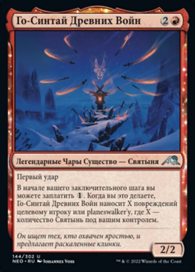 | Rules | First strike At the beginning of your end step, you may pay . When you do, Go-Shintai of Ancient Wars deals X damage to target player or planeswalker, where X is the number of Shrines you control. |