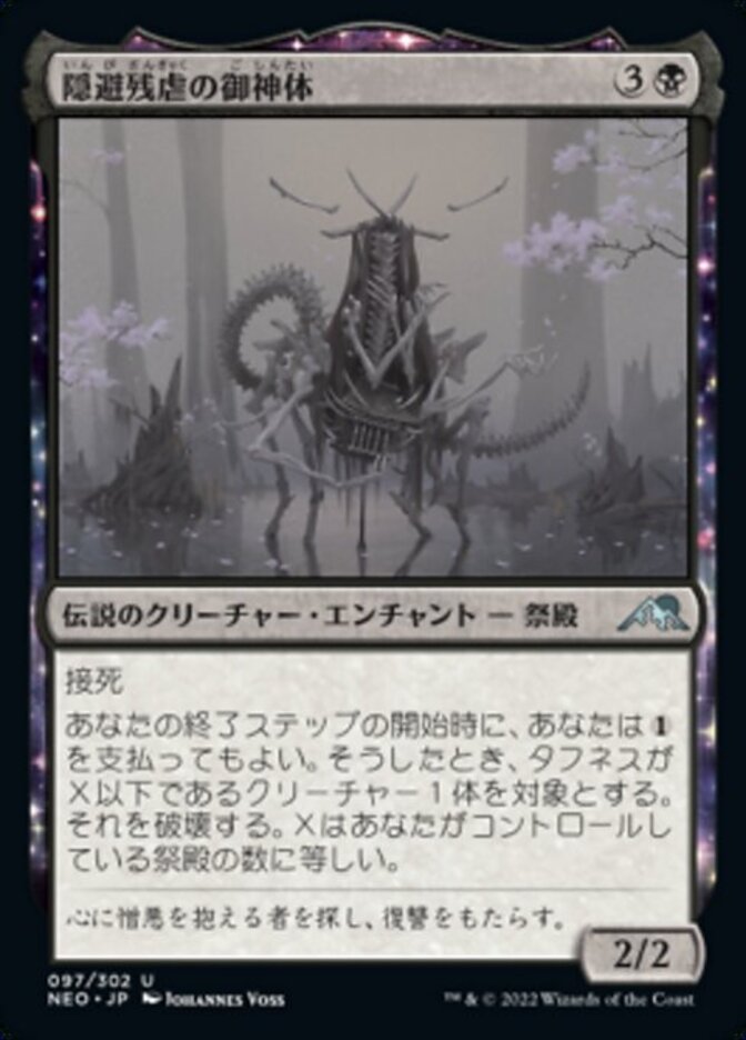 | Rules | Deathtouch At the beginning of your end step, you may pay . When you do, destroy target creature with toughness X or less, where X is the number of Shrines you control. |