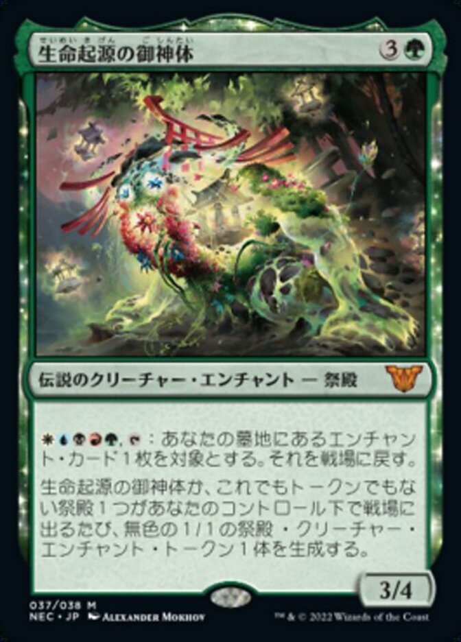 | Rules | , : Return target enchantment card from your graveyard to the battlefield. Whenever Go-Shintai of Life's Origin or another nontoken Shrine enters the battlefield under your control, create a 1/1 colorless Shrine enchantment creature token. |