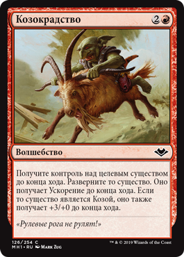 | Rules | Gain control of target creature until end of turn. Untap that creature. It gains haste until end of turn. If that creature is a Goat, it also gets +3/+0 until end of turn. |